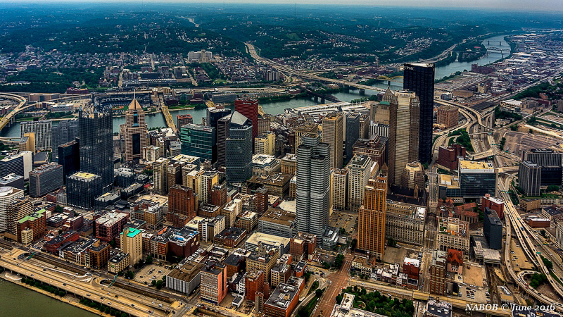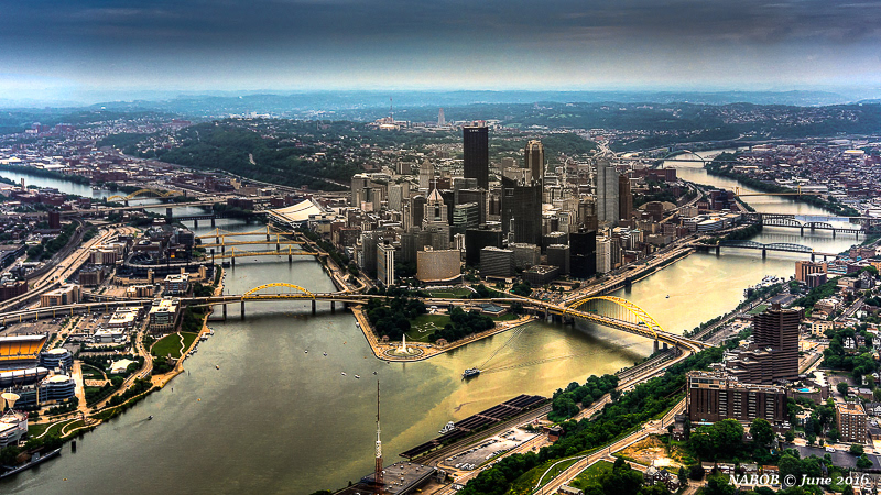 Pittsburgh, PA: Downtown skyline looking northeast; Allegheny River on left and Monongahela Right on the right merge to form the Ohio River. 13 of the city's 17 bridges are in view.