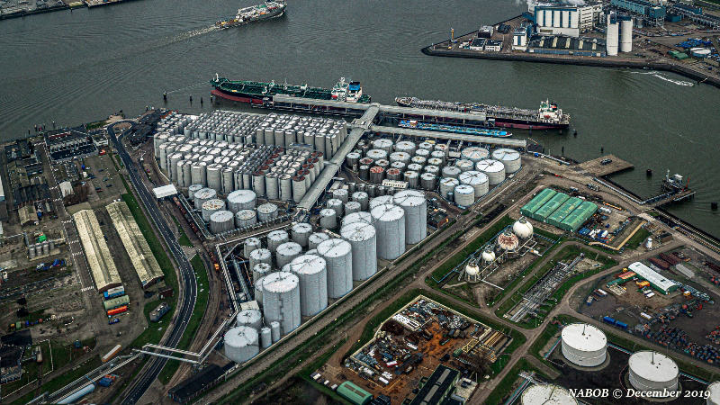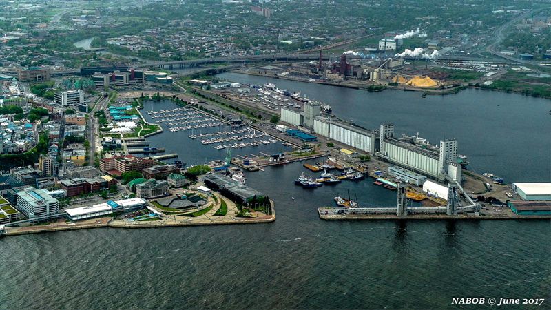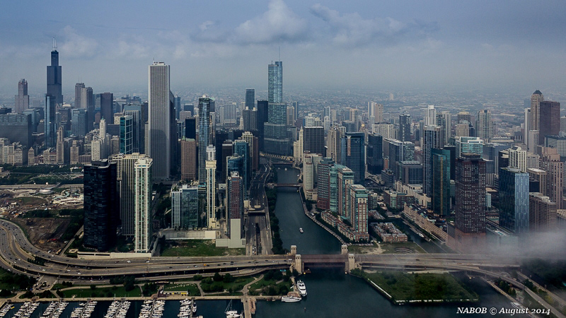 Chicago, IL Downtown skyline viewed while flying over the Chicago River Locks at Lake Michigan. Note the fog rolling off the lake.