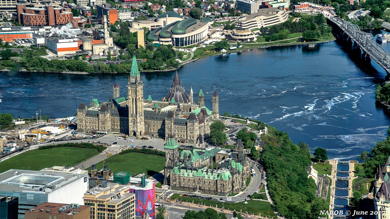 Ottawa, Ontario, Canada: Aerial view of the Rideau Canal, Union Station, National Arts Centre, Parliament Hill and Fairmont Château Laurier